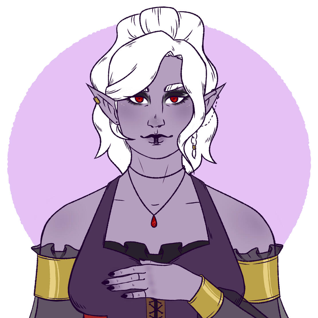 TW: DeathLlorelei is a True Neutral Drow Bard of the College of Spirits. Originally born into Lolthite society, she felt she didn't really agree with its teachings and ran away from home once she reached maturity. She managed to find her way to the surface, where she was adopted by a community of followers of Eilistraee, with whom she felt more comfortable. During her stay with this community, Llorelei learned of the courtesans and, mainly attracted by the artistic and educational aspect of it, as well as the luxury, she decided to learn how to be a courtesan. During her formation she made friends with another Drow by the name of Amalica, with whom she was very close. Right before being initiated as true courtesans, however, Amalica died under unkown circumstances. Striken with grief, Llorelei never completed her training and decided to leave the community and explore the surface world. A while after Amalica's death, Llorelei noticed that the ankle bells her friend gave her during their training would stop making sounds whenever a specific word was said : "Amalica".Having found an interest for dancing, playing violin and storytelling while training to be a courtesan, Llorelei decided to start playing at cabarets and taverns, hoping to gain money and recognition. One day, a troupe of bards and entertainers found her and were impressed by her skills, and they asked her to join them, which she accepted. She traveled with her troupe until one faithful day, where they, including her, were all taken away into the mists of Barovia. There, she met a group of adventurers who were in a similar situation as her, and they decided to look for a way out by breaking the curse that affected the land of Barovia.Llorelei met Strahd Von Zarovich during her travels, at first as an "ally" and later as an enemy. He had taken an interest in her and they met a few times, before she knew he was the source of the curse. Eventually feelings developped. However, at that moment Strahd's behavior became more erratic and cruel and Llorelei and her party learned of his goals. They fought against one another, and feelings came forward during their final battle. This made Strahd stop fighting back, and after a lengthy discussion, they found a way to possibly break the curse, which unfortunately needed Strahd to be slayed. Before being slayed, he and Llorelei promised to be with each other in the events that he comes back. That hopeful scenario is what ended up happening, and they now live together in Castle Ravenloft.Individual Tag: #dance macabre [llorelei]